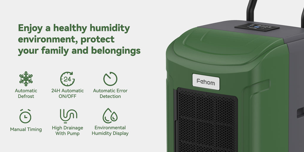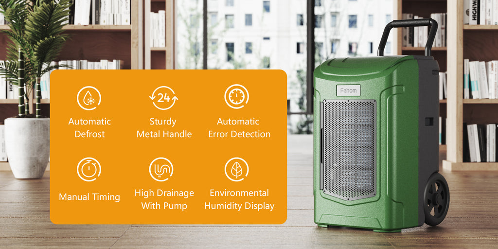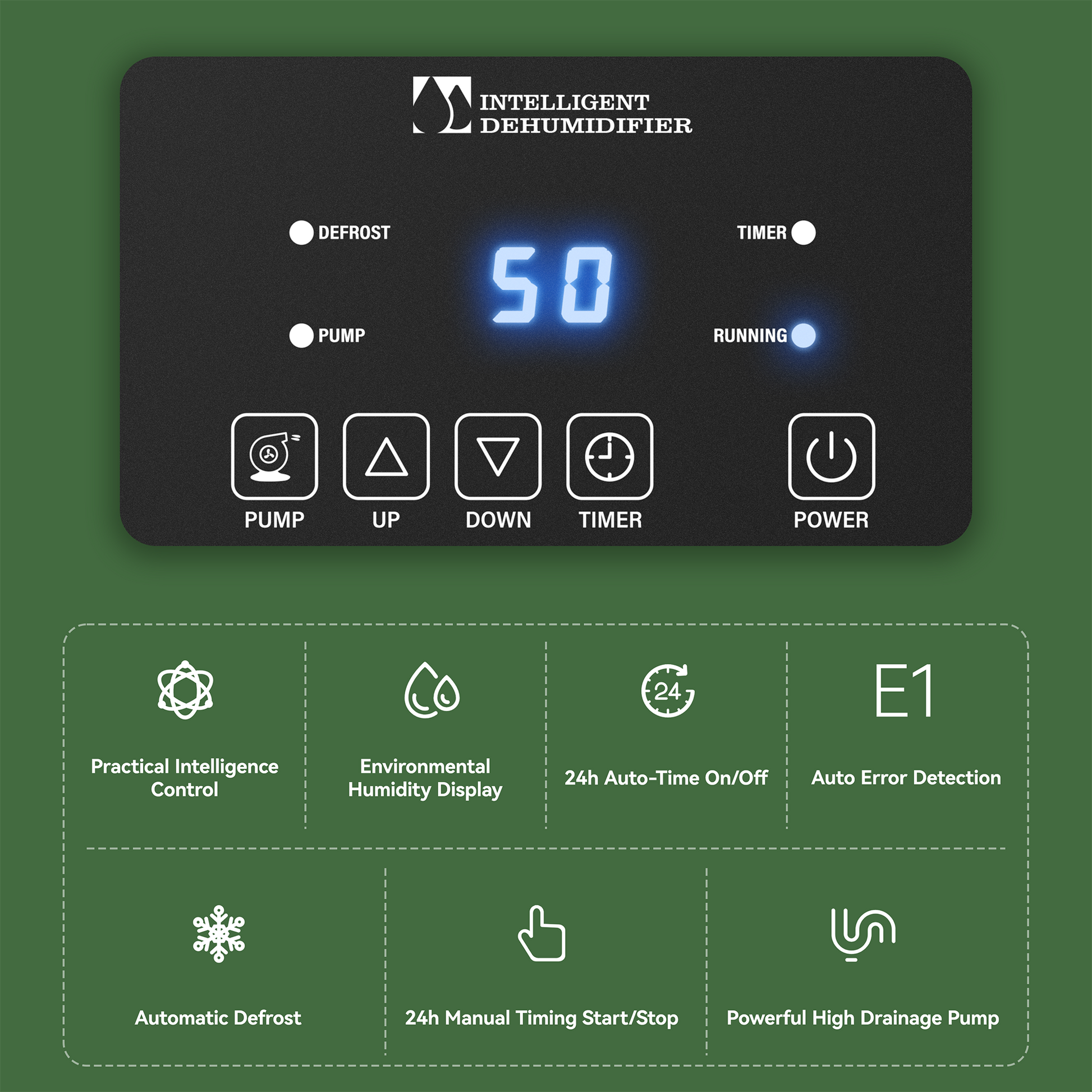 Intelligent Operation: Features a built-in humidity sensor for automatic humidity control. Includes a heavy-duty condensate pump with a 15 ft. drain height and a 9.84 ft. drain hose for convenient automatic drainage, or use the removable rubber plug for manual drainage.
